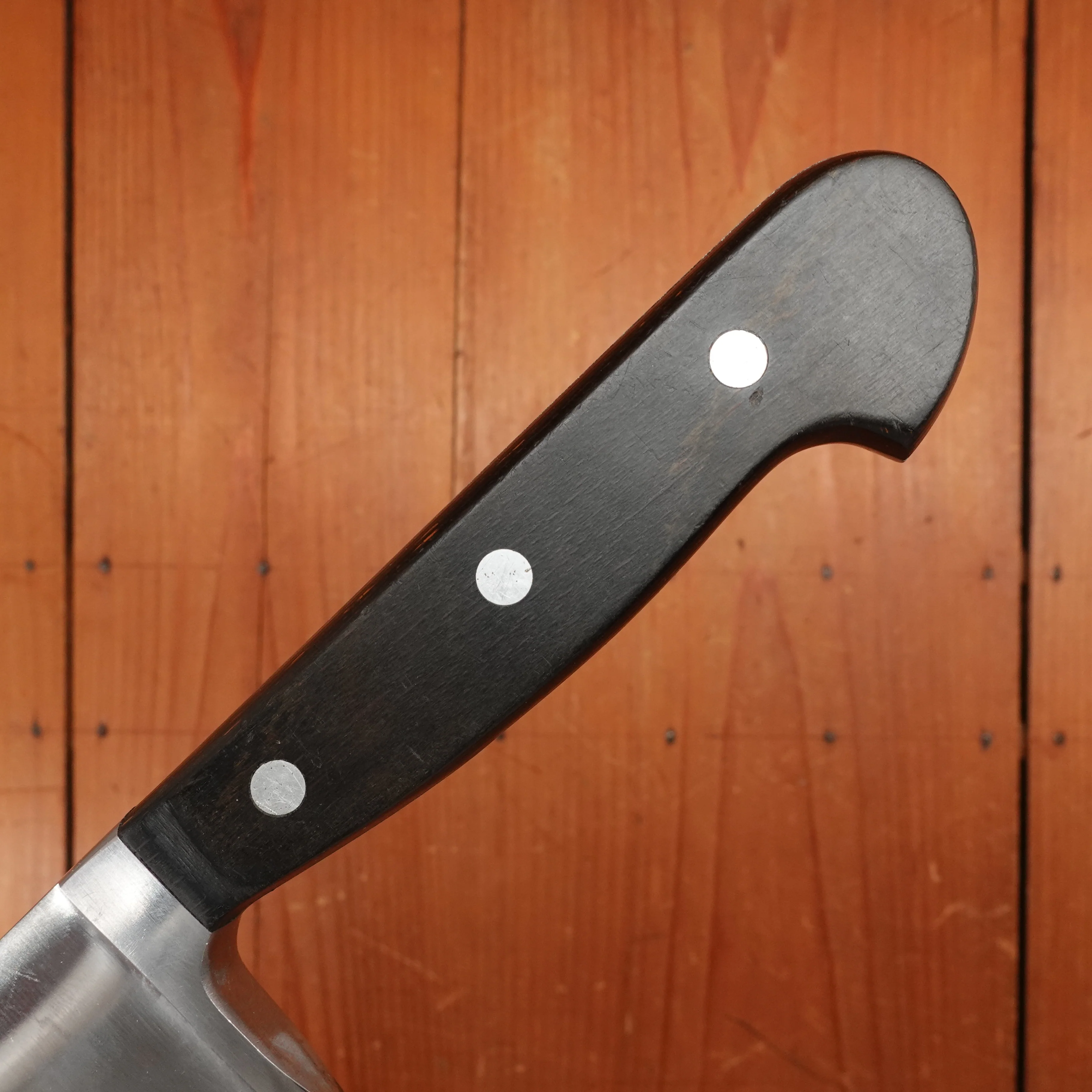 Heavy chef knife from F Dick from the late 70s or 80s with fully forged stainless blade and old style pakka wood composite handle and aluminum rivets, the typical handle configuration of the 1970s and 80s before POM plastic became the norm.