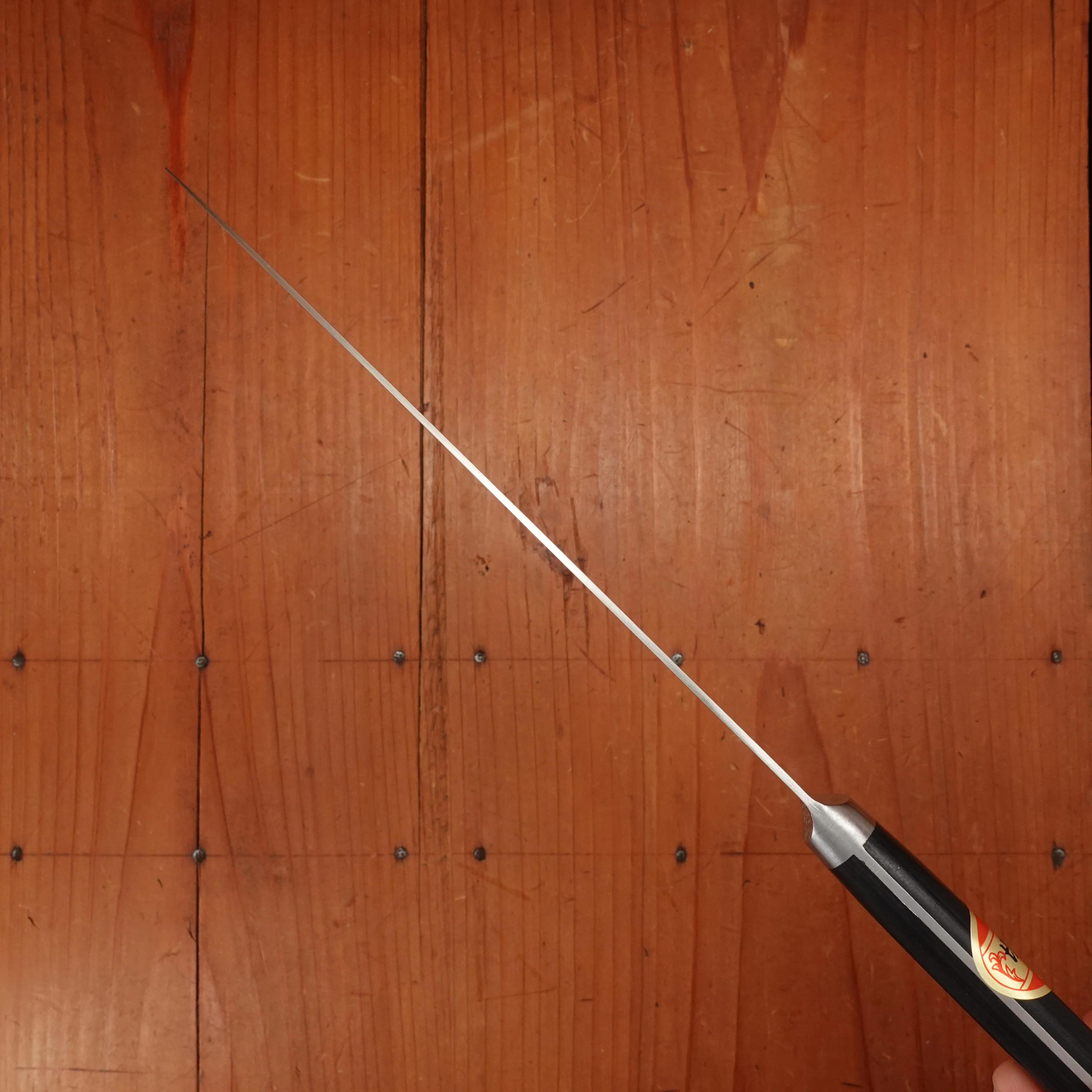 Sakai Kikumori's Nihonkou line are reasonably priced factory made carbon steel knives with a carbon content of .95%, hardened to approx 63 HRC. Nihonkou knives’ thin mono-steel blades are super easy to sharpen and get a nice edge that holds well.